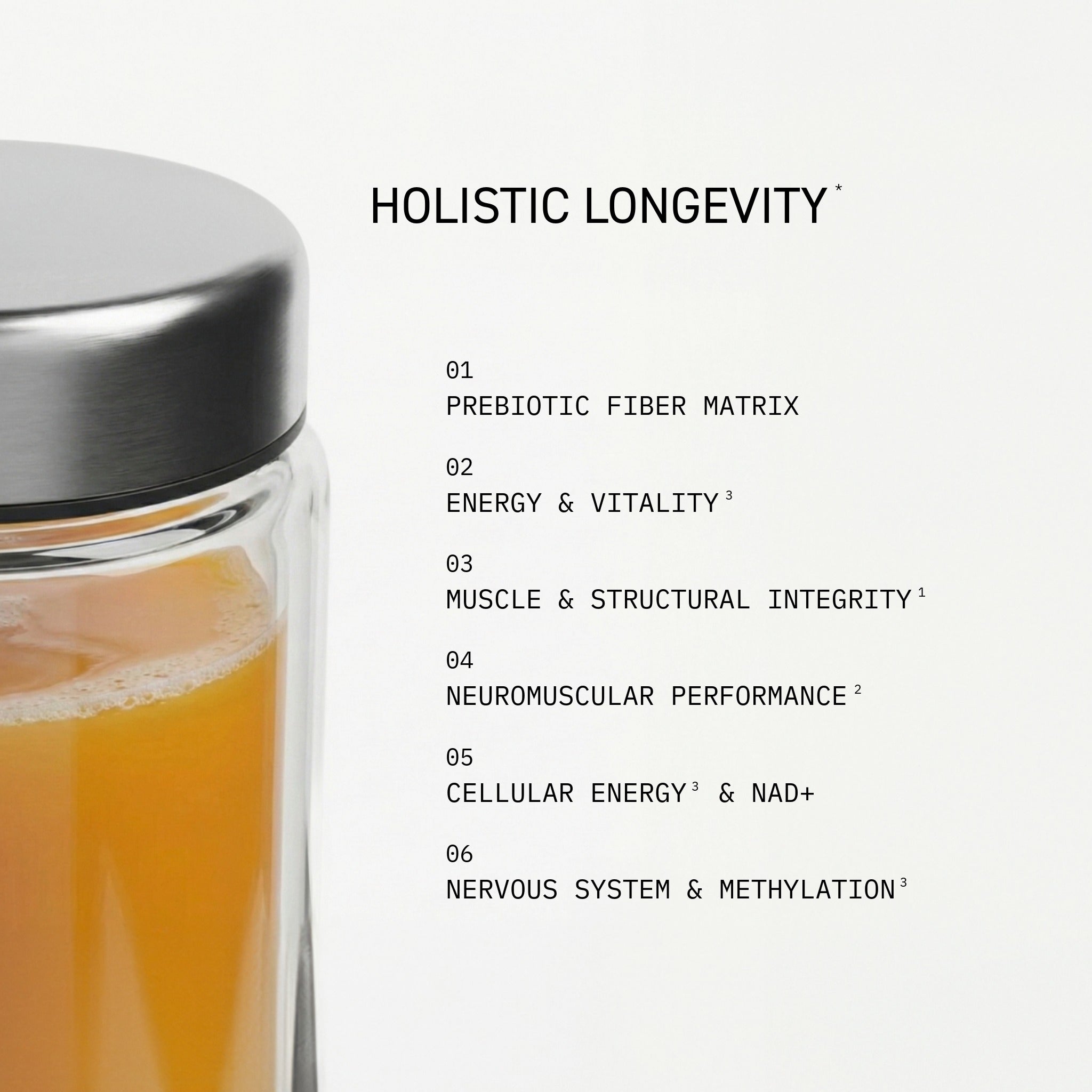 ¹ Protein: Proteine tragen zum Aufbau und Erhalt der Muskelmasse bei.² Kreatin: Kreatin steigert die körperliche Leistungsfähigkeit bei kurzzeitigen, hochintensiven Belastungen (dieser positive Effekt wird mit einer täglichen Einnahme von 3 g Kreatin erzielt). Die tägliche Einnahme von Kreatin kann die Wirkung von Krafttraining auf die Muskelkraft bei Erwachsenen über 55 Jahren verstärken.³ Magnesium: Magnesium trägt zu einer normalen Funktion des Nervensystems und einem normalen Energiestoffwechsel bei.⁴ Ballaststoffe: DAILY VITALITY ist reich an Ballaststoffen (> 6 g / 100 g).⁵ Cholin: Cholin trägt zur Erhaltung einer normalen Leberfunktion und eines normalen Fettstoffwechsels bei.⁶ Vitamin C: Vitamin C trägt zum Schutz der Zellen vor oxidativem Stress bei.*Langlebigkeit / Leistungsfähigkeit / Widerstandsfähigkeit: Diese nicht spezifischen gesundheitsbezogenen Angaben werden durch die nachgewiesenen Wirkungen der enthaltenen Nährstoffe (Protein, Magnesium, Kreatin, Vitamin C) gemäß Art. 6 Abs. 1 lit. f DSGVO belegt. Artikel 10 Absatz 3 der Verordnung (EG) Nr. 1924/2006.